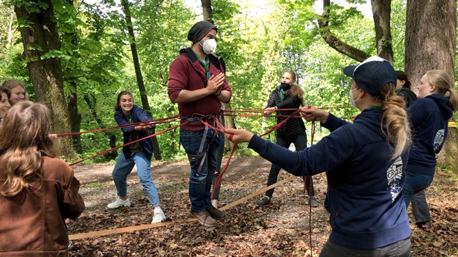 Am 12. Mai haben unsere Leiter zwei Slacklines aufgespannt. Die meisten von uns hatten nicht wirklich Lust gehabt, direkt am Morgen Sport zu machen, trotzdem haben wir versucht, erfolgreich über die Slackline zu laufen. Natürlich wäre es langweilig, einfach über das Seil zu laufen, also haben unsere Leiter sich verschiedene Challanges überlegt.